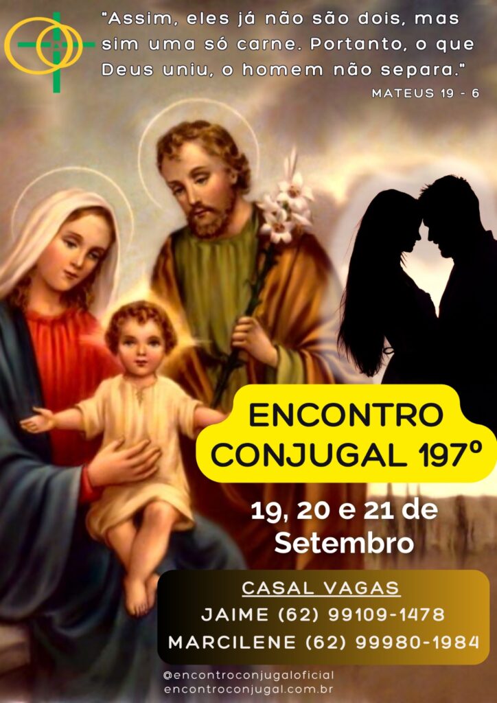 Encontro Conjugal 197ºDias 19, 20 e 21 de SetembroInformações – Casal VagasJaime 62 99109-1478Marcilene 62 99980-1984 Posts Relacionados Passinho – Edição 531 – Janeiro 2025 Deixe um comentário Noite de Caná – 30/01/2025 Deixe um comentário Inscrições Encontro Conjugal 195º Deixe um comentário